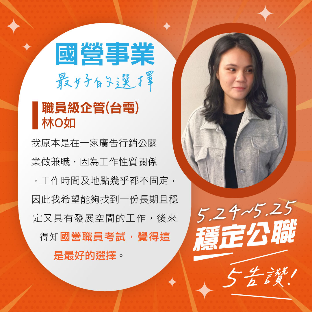 | 5月 | 台電僱員 | 1.考科少、待遇佳 2.短期衝刺好選擇 3.114預計招募千人! |
