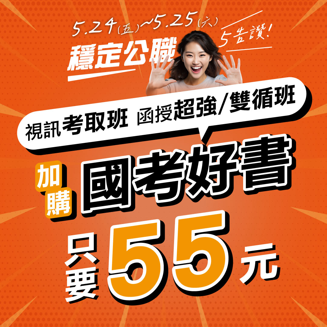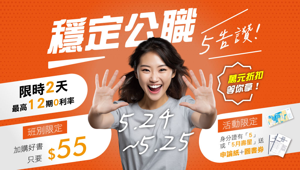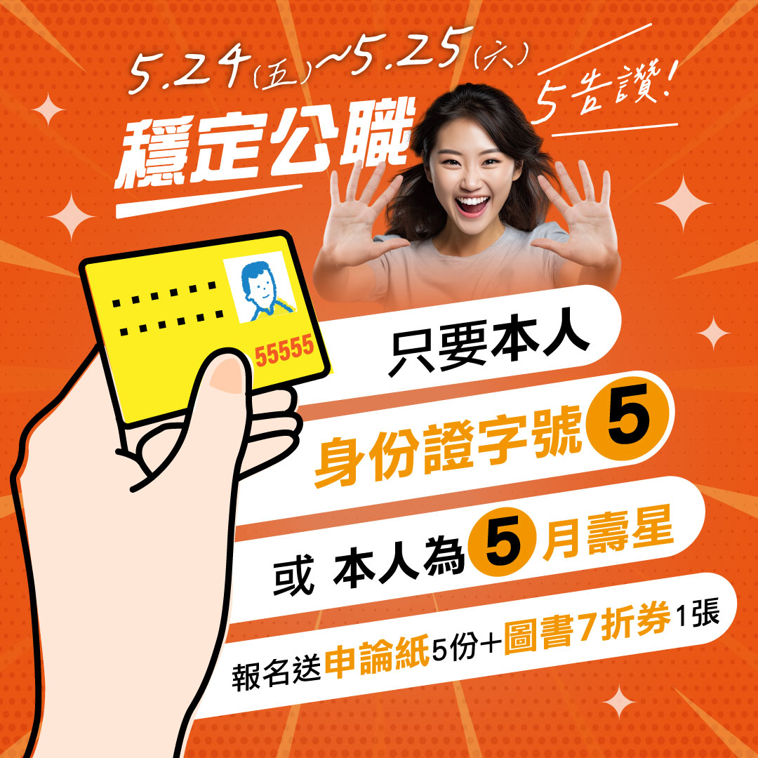| 好禮5告讚 身分證有「5」 或「5」月壽星 報名送申論紙+圖書7折券1張 ![]() ![]() |
