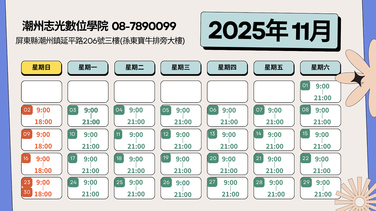 潮州志光數位學院門市營業時間 ●週一至週六 09:00-21:00 ●週日/國定假日 09:00-18:00 ( 營業時間依下圖為主 )