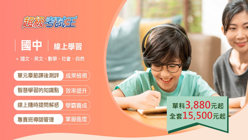 名師線上教學不停課,24小時『學習』不打烊,不受時間地點限制,宅學習安心又便利。全國最完整雲端『素養考題』題庫,附加詳解與弱點分析,線上『發問』老師親自回答,讓您的小孩面對段考/會考拿滿分,更多訊息電洽超級考試王-東港志光08-8350606
