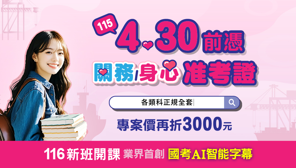 【4/2~4/30】憑115關務/身心特考准考證,報名正規全套課程,再折3000元