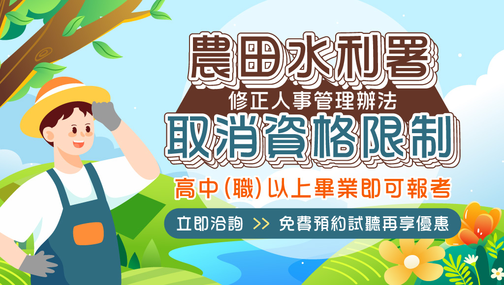 農田水利署中各項事務或政策執行,都屬於行政的範圍,涵蓋範圍廣泛,多為文書類為主。而考科與各類公職行政類科相同,相當適合搭配投考,上榜機會再增加,詳情請速洽新莊志光數位學院。