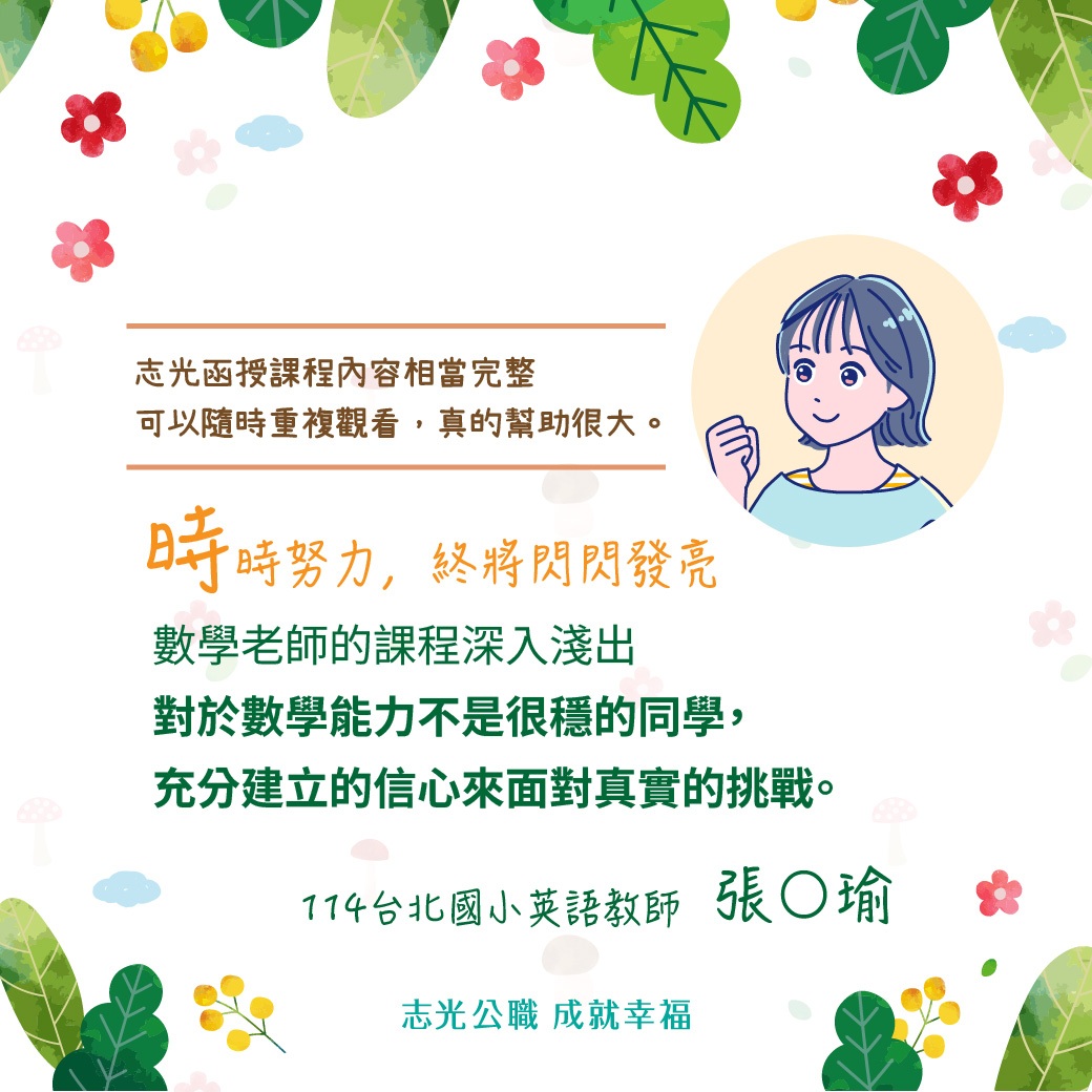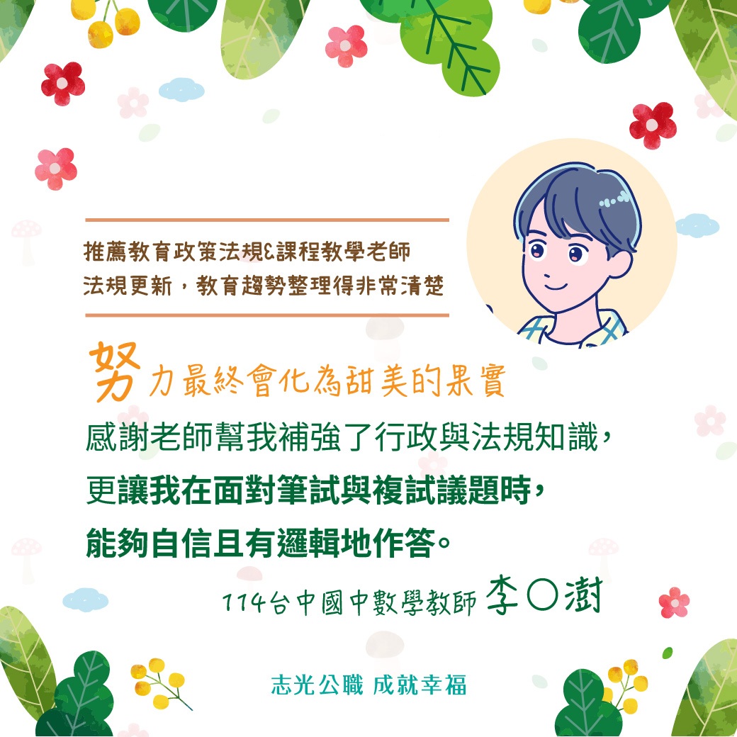 高通老師擅長整理最新的教育法規與教改趨勢,用深入淺出的方式講解教育政策的變化,不但幫我補強了平時較少接觸的教育行政與法規知識,更讓我在面對筆試與複試的教育議題時,能夠自信且有邏輯地作答。對於像我這樣白天上課代理、晚上回到家又要兼顧家庭照顧的人來說,這樣的資源與老師真的是考場上的一大助力。
