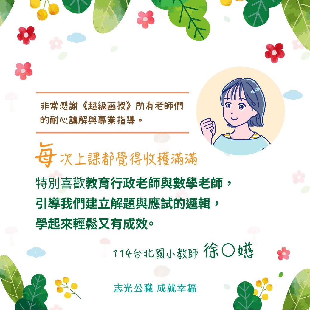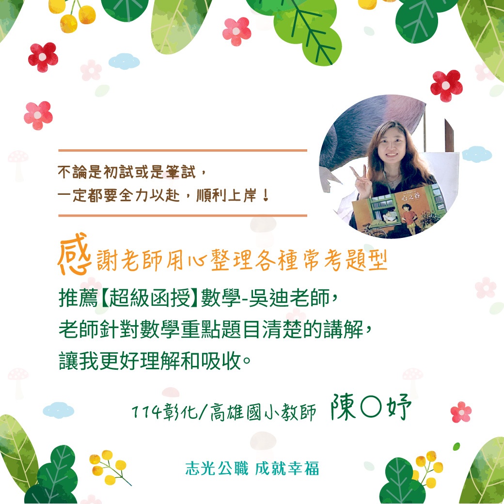 國文江河老師他擅長以說故事的方式,帶我們深入了解國學常識的淵源、成語背後的歷史,更會清楚指出會考的重點與準備策略。也因為這樣,我在準備國文科時能更有方向、事半功倍,讓整個學習過程變得既輕鬆又紮實。 數學吳迪老師,循序漸進,搭配大量的歷屆試題練習,幫助我熟練掌握各種解題技巧。特別是他整理的國小數學教材與教學方法,讓我更清晰地理解小學數學的教學脈絡與邏輯。