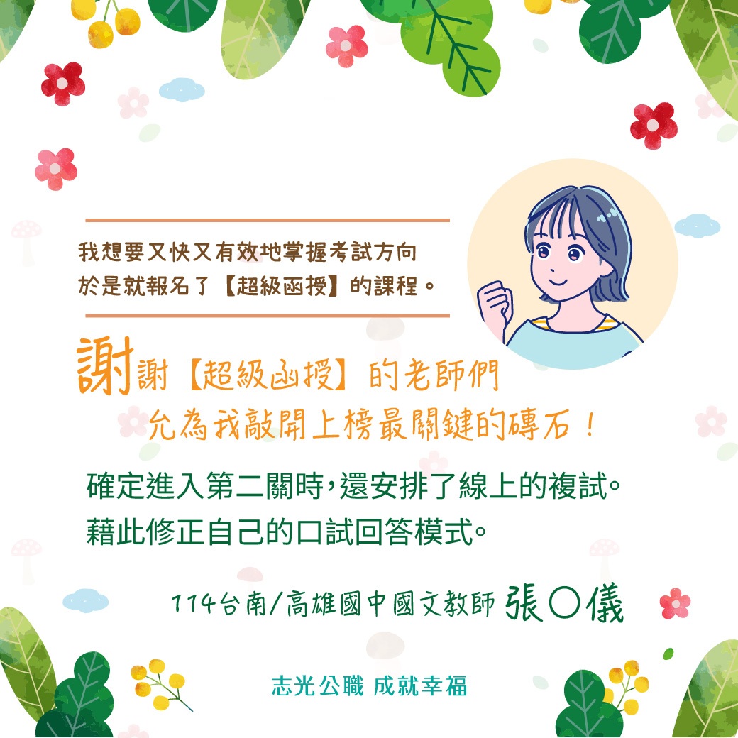 決定到門市購買線上超級函授課程,這是我今生做出最棒的決定。劉玥老師精闢解說教心與輔導理論;高通老師把課程理論整理的簡易明瞭;黃天老師的教育史哲用說故事的方式令我感到平易近人;林特老師用心解說教育行政。再加上老師整理的板書筆記,讓考生輕鬆抓取重點,也利於平日的複習。