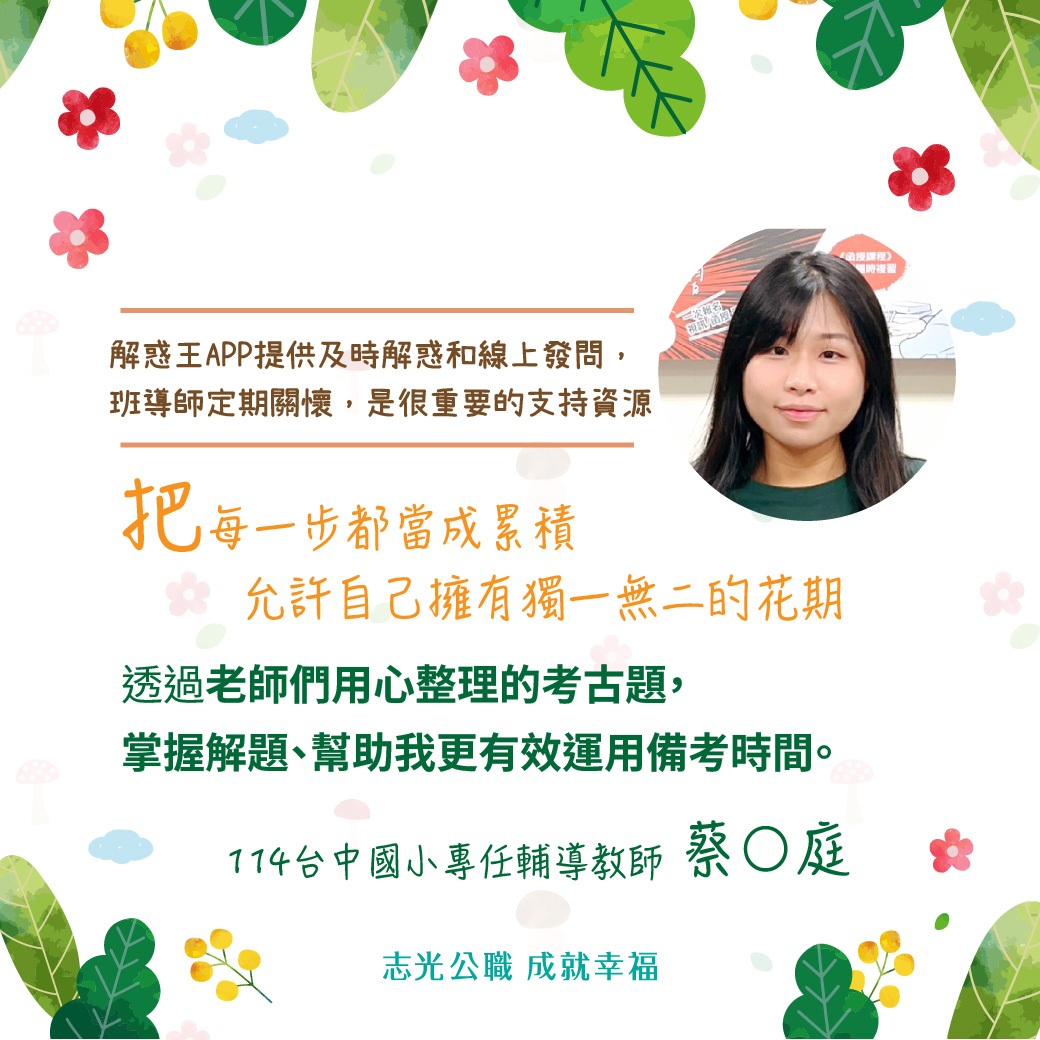 函授課程的優點是,可以自行規劃上課時間且反覆聆聽,超級解惑王APP提供及時解惑和線上發問,班導師會協助規劃課表,定期關懷進度和狀態,是很重要的支持資源!對於二月才開始準備考試的我來說,函授課程能讓我快速複習過去學過但遺忘的知識點,也能透過老師們用心整理的考古題,掌握解題關鍵、還需要加強的部分,幫助我更有效運用「永遠都覺得不夠用」的備考時間。