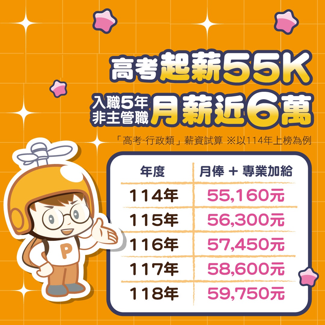 | 薪水 - 相對優渥 | 普考起薪41K起、高考起薪55K起;薪資水準較民間企業相對優渥。 |