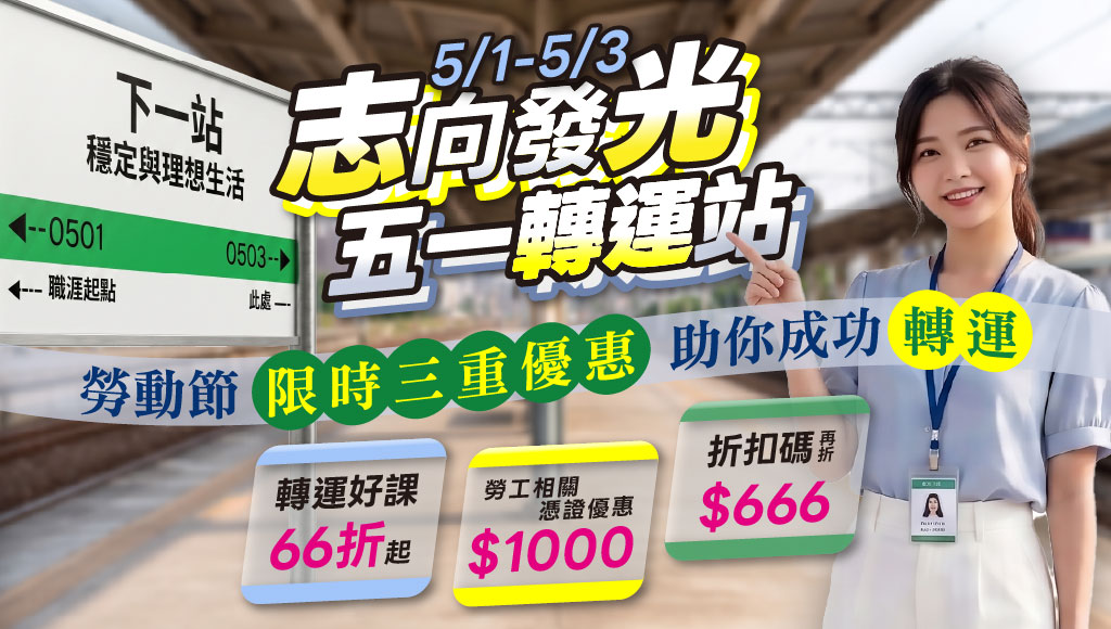 | <<應屆畢業優惠>> 5/1-5/31高中職、大學、研究所應屆畢業生,報名全類科正規全套課程,享當下優惠折數後再減1,000元 |