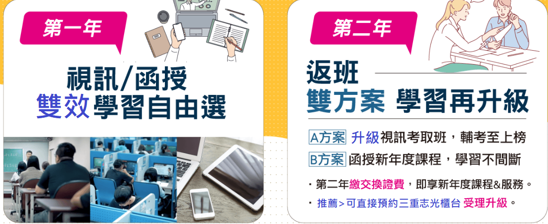 - 優勢二:1+1>2,兩年全新課程與輔考資源,物超所值!