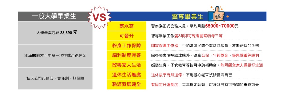 - 免當兵:畢業通過特考,直接分發警察,免服兵役