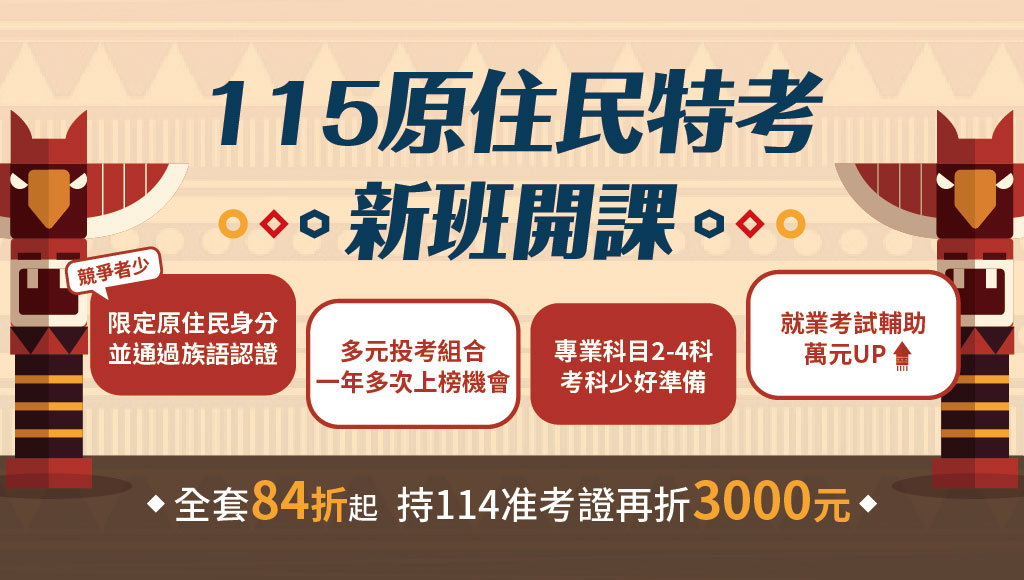 | 114原住民特考簡章 | 完整輔考服務 | 歷屆試題下載 | 優秀錄取榜單 | |