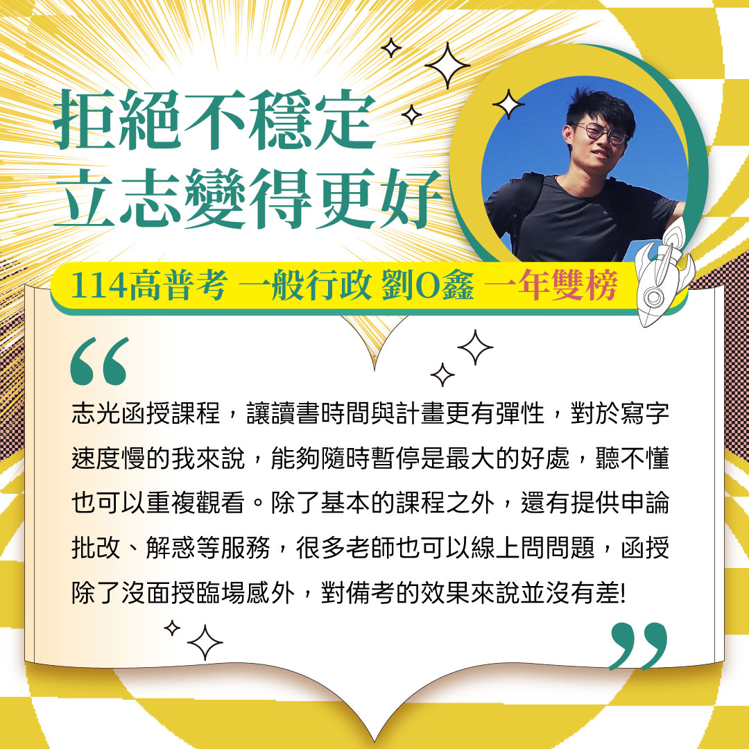 | [考試的科目對我來說相當陌生,因此有專業的老師和整理好的課本講義,是我覺得能最快進入各個科目世界的方式。] | [上課時間很彈性,可以依照自己的進度和作息來排課,而且不清楚或聽不懂的地方還可以倒帶回去反覆多聽幾遍] | [感謝志光補習班提供的學習資源,讓我可以以非本科生的身分,在準備一年內就以不錯的成績上榜] | [對於非本科生而言,如同老師上課說的,應該要想1年、5年、10年後的自己想是什麼樣子,成為我努力下去的動力] |