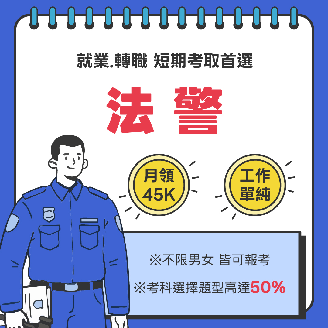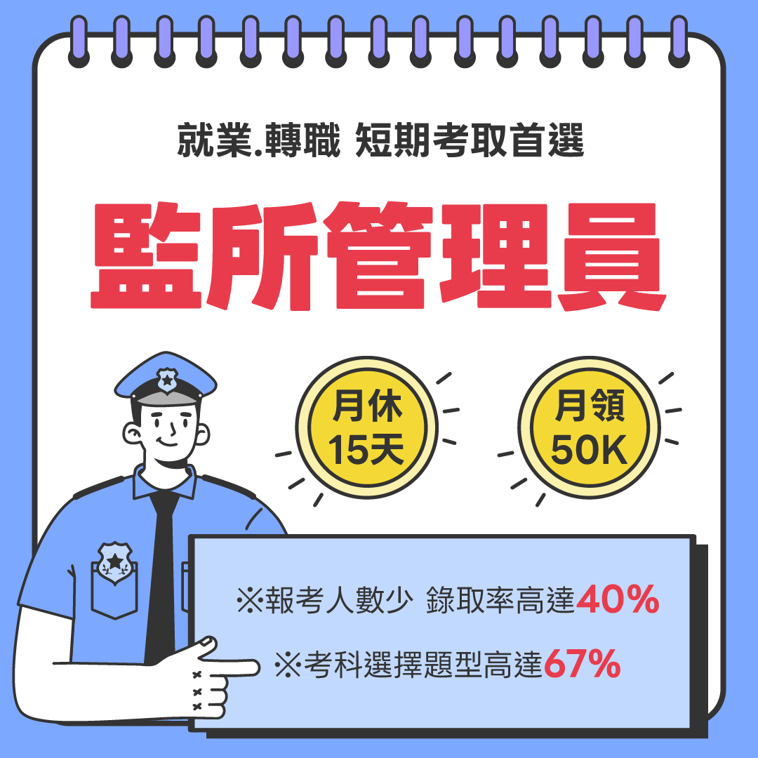 法院書記官、法警、執達員、執行員、監所管理員 ♦班導師小叮嚀♦ 準備監所管理員 再加一科【警察法規】 也能同步報考警察喲! |