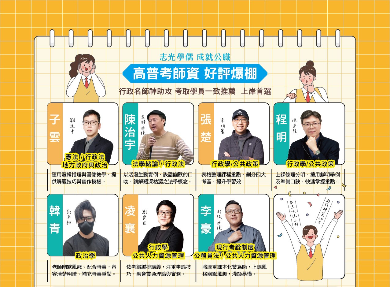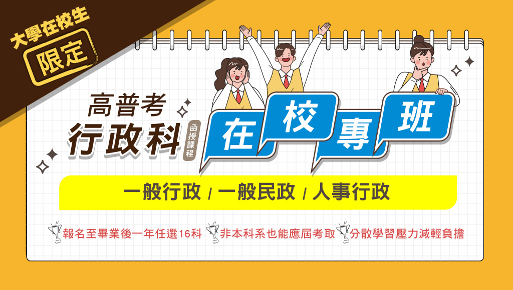 公職考、國營就業考科重疊,一次準備,多次上榜機會,彈性選擇考試科目,可報考高普考/地方特考/初等考-一般行政/一般民政/人事行政、台電僱員-綜合行政。