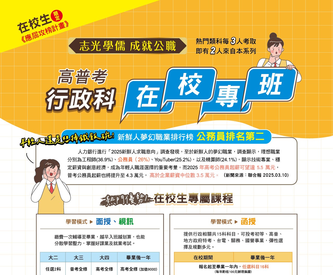 【校園專案】行政科在學生16科自由選,提供畢業+1年