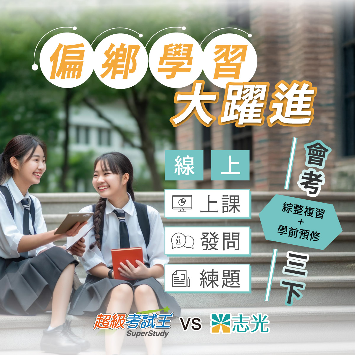 分科測驗、學測、高中進度 下學期先修、國中會考、國高中補習,超級考試王全國連鎖補習班,名師雲端線上學習,新型態模式,兼顧彈性與專注,課輔資源皆提供。獨家限定在地學子優惠價,超級考試王課程全面3折起,7/31前學霸之路有你挺我活動,優惠再享最高2500元折扣優惠。新北市、台北市、基隆 地區分校,邀請您立即預約免費試讀