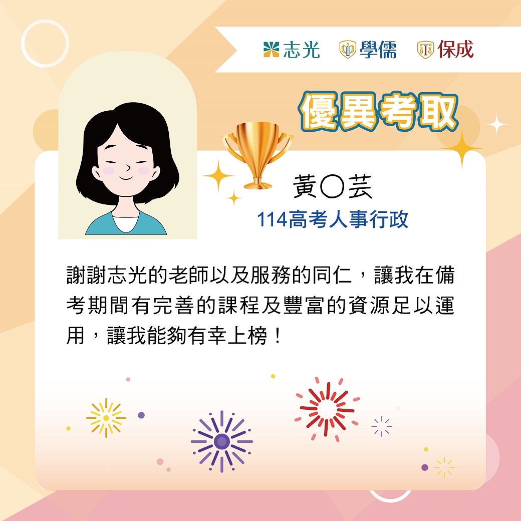 [考試的科目對我來說相當陌生,因此有專業的老師和整理好的課本講義,是我覺得能最快進入各個科目世界的方式。] | [上課時間很彈性,可以依照自己的進度和作息來排課,而且不清楚或聽不懂的地方還可以倒帶回去反覆多聽幾遍] | [感謝志光補習班提供的學習資源,讓我可以以非本科生的身分,在準備一年內就以不錯的成績上榜] | [對於非本科生而言,如同老師上課說的,應該要想1年、5年、10年後的自己想是什麼樣子,成為我努力下去的動力] |