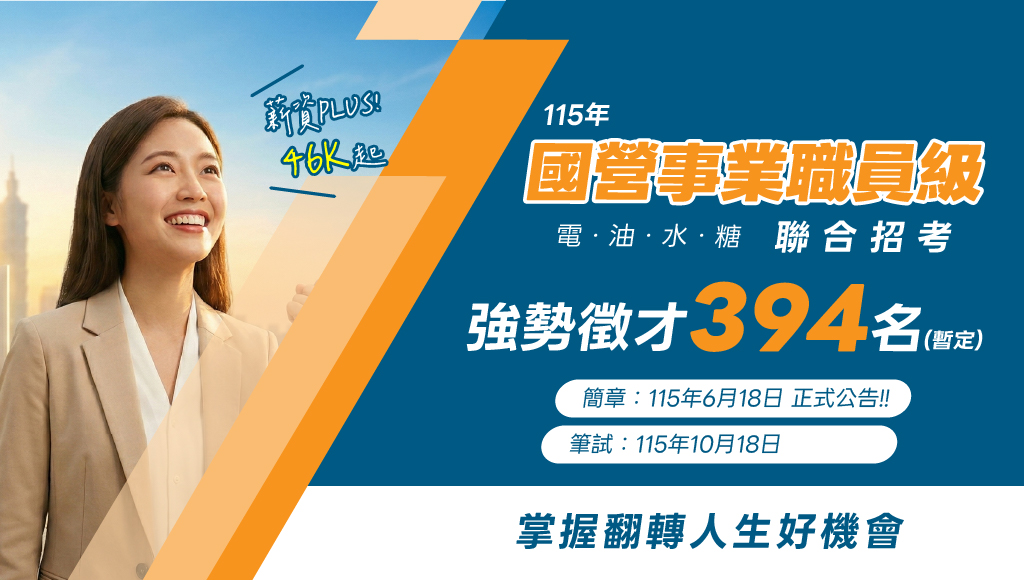 起薪46K起!115國營事業招考強試來襲️ 想追求穩定、高起薪、好福利? 油、電、水、糖 四大國營龍頭聯招,今天正式公告考情! 這絕對是今年「最適合年輕人」的入職門票! 考情亮點搶先看: 【名額多多】 預計招考 394名 新進職員 【薪資再漲】 起薪再上漲!新人 46K 起,升遷制度透明 【獎金誘人】 年終最高上看 4.4個月 【環境優渥】 國營事業福利完善,生活與工作平衡 重要時程快筆記: 簡章公告: 115/06/18 筆試日期: 115/10/18 翻轉人生,現在就是最佳時機!
