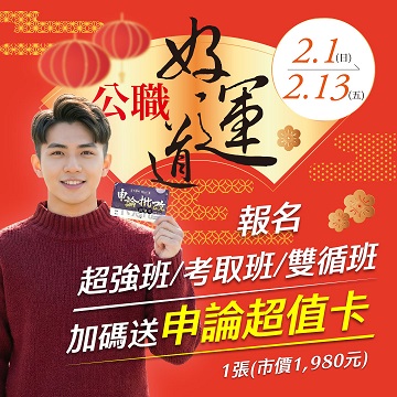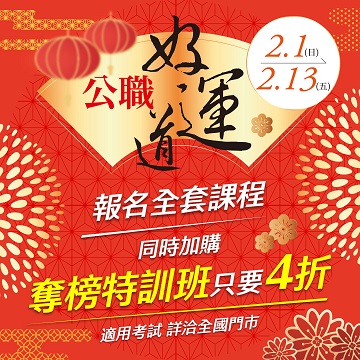 【活動優惠】2/1~2/13 公職好運道,全套課程82折起