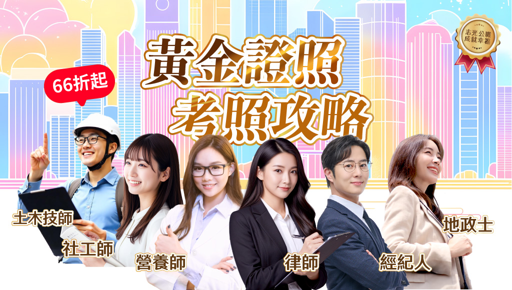 證照夯!志光助您快速考取專技證照!一次掌握律師司法官、地政士、不動產經紀人、營養師、土木技師與社工師最新考情!提供各科準備重點。無論是在職進修或應屆畢業,助您高效率奪照加薪。立即查看考取學長姊攻略!