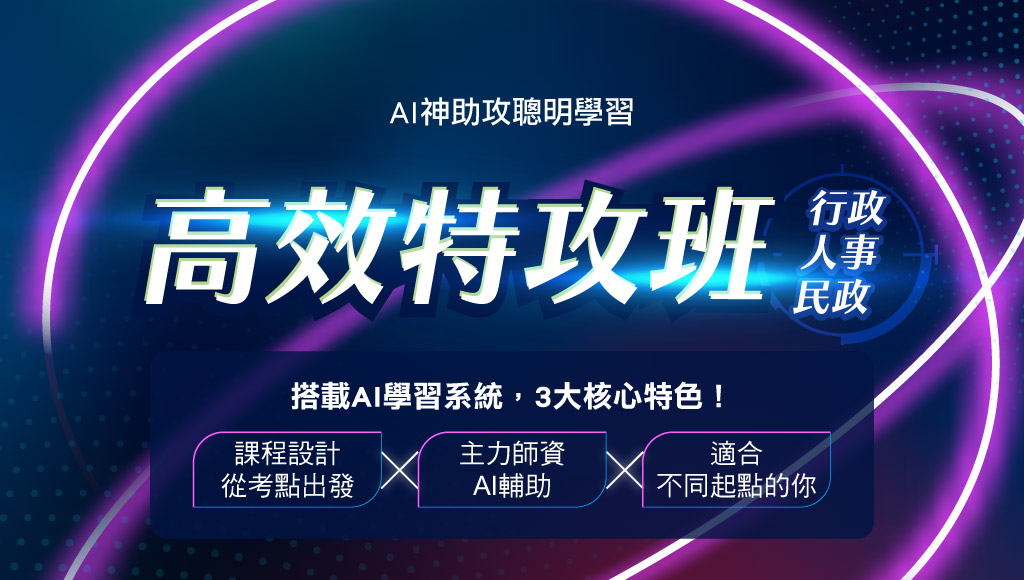 課程設計從考點出發/著重「命題大綱&出題趨勢」,老師親自設計課程主題,只教出題機率高的,聚焦易考必會關鍵內容,快速建立新的學習模版。主力師資AI授課/一線師資團隊,搭載AI智能系統授課,以「整合關鍵觀念」為主軸。名師指導、AI學習、輔助真人解惑,傾全力讓你快速上榜。適合不同起點的你/「新手」開啟全科輪廓、建立信心,無須擔心自己是「國考小白」;「舊生」整理脈絡、強化得分點,無須擔心再度成為「國考卡卡」;「忙碌族」用有限時間换最高效益,無須擔心變成國考白忙族。
