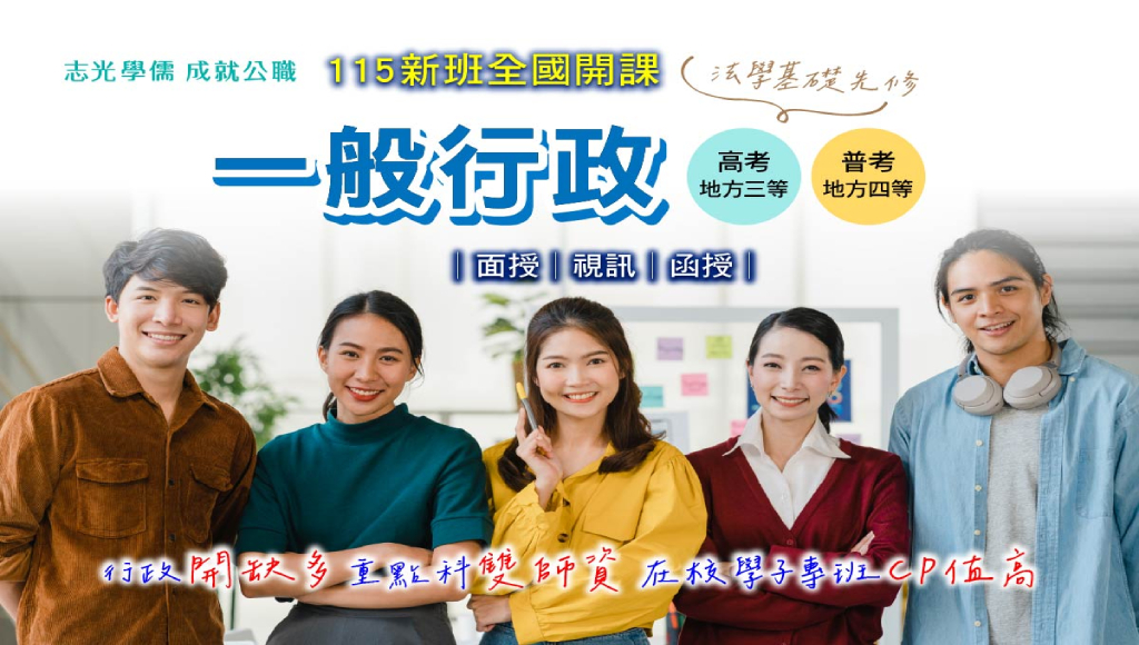 一般行政類科,每年固定開缺,為高普考缺額最多的類科之一,高普考3月報名、7月考試,地方特考9月報名、12月考試。穩定缺額、穩定薪資、穩定福利。高普考一般行政考試科目跟地方特考、初等考相近。一次準備多次上榜機會!考試諮詢與規劃就找桃園、南崁、蘆竹、最推薦公職補習班,南崁志光數位學院