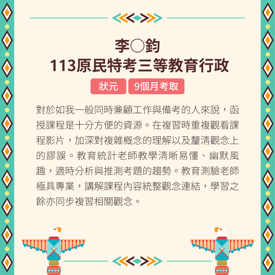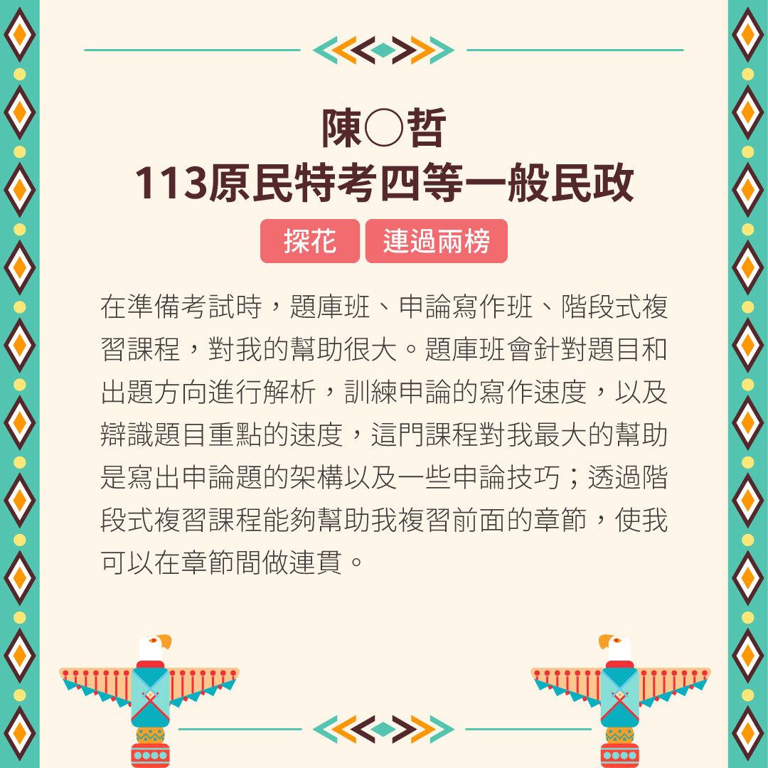 | 上榜生推薦. 程明(陳正隆)老師上課不但有豐富的體系圖,且常以生活化的內容做為話題,讓原本抽象的行政學概念變得更為具體。 | 上榜生推薦. 張楚(李明寰)老師擅長畫架構圖,順著架構去記憶,重要考點往往都能記住,之前台水也靠著老師教的內容考上了初試。 |