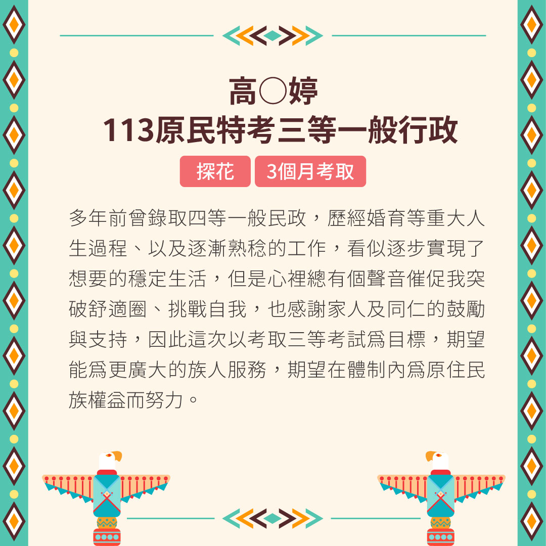 | 應考資格 1.原住民族三等 -大學以上學歷畢業 -須取得原住民族委員會核發之原住民族語言能力中級以上認證合格證書 2.原住民族四等 -高中職以上學歷畢業 -須取得原住民族委員會核發之原住民族語言能力初級以上認證合格證書 3.原住民族五等 -不限學歷 -須取得原住民族委員會核發之原住民族語言能力初級以上認證合格證書 |