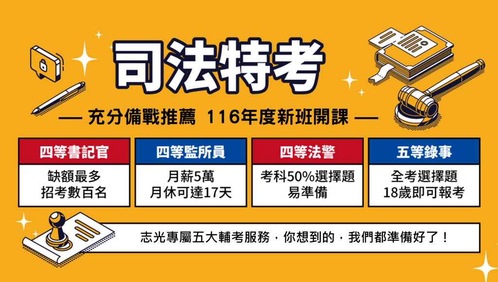 【司法特考四五等】116年度新班開課|考試資訊通通告訴你