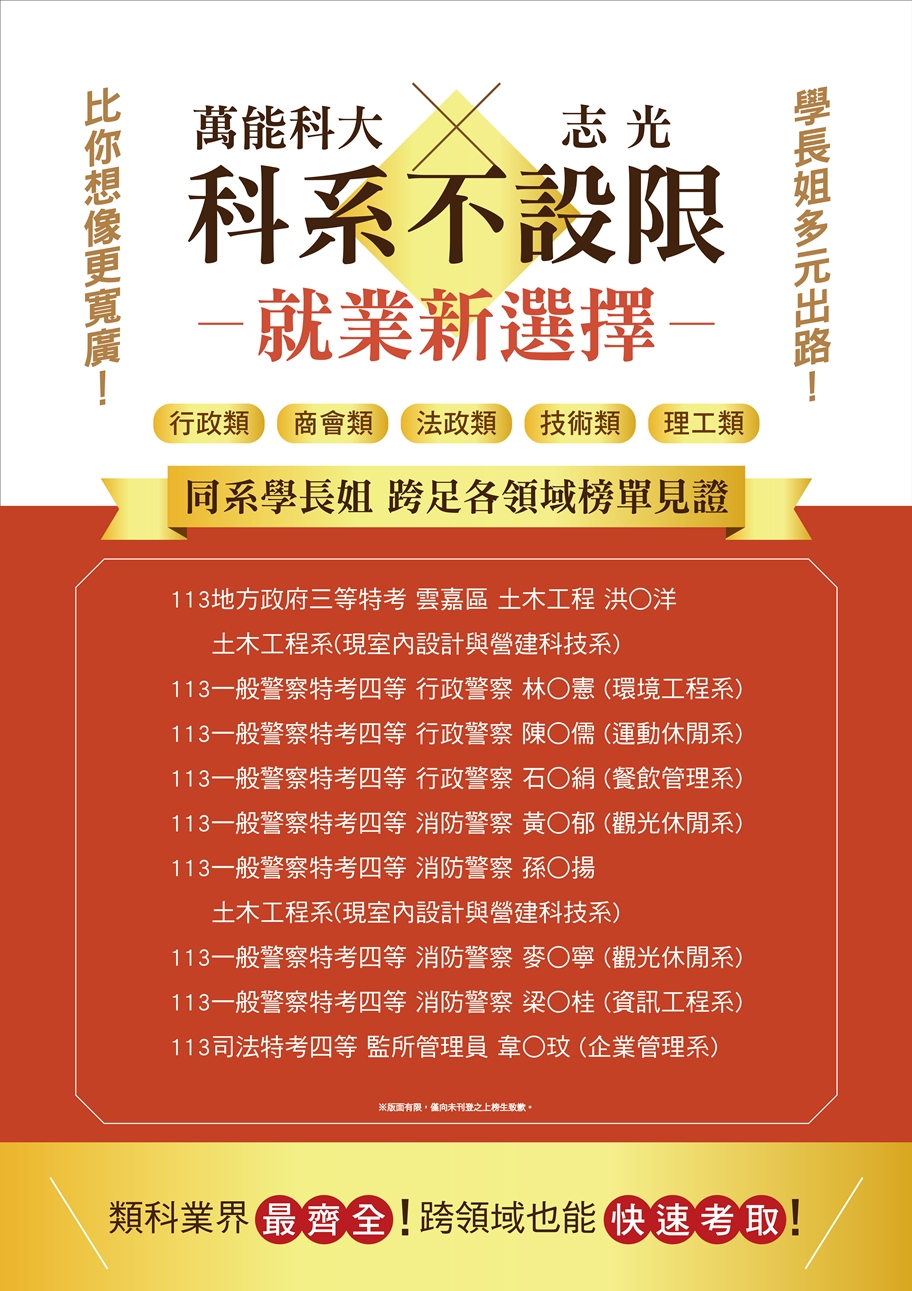 在校期間是一個適合所有想要挑戰國考考生的機會,志光數位學院楊梅分校為您提供校園購課專案,讓您在學期間就能開始為未來鋪路!只要您在校期間報名高普考、一般警察、司法特考、國營事業...等公職、證照、國營事業特考課程,立即享有萬能科技大學專屬優惠!多種大學生最適合報考的在校專班,更能助您從報名後輔導至畢業後1年,速洽03-2639188量身規劃您的專屬課程!