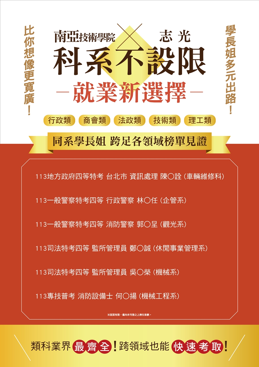 標籤: 高考(三級) 普考 初等考 地方政府特考-四等 地方政府特考-三等 一般警察-四等 司法特考-四等 司法特考-五等 司法特考-三等 教師甄試 國營事業聯招新進人員 台電新進僱員 專技高考 專技普考 郵局專業職(二) 銀行考試 中華電信業務類 中華電信電力類 原住民特考-三等 原住民特考-四等