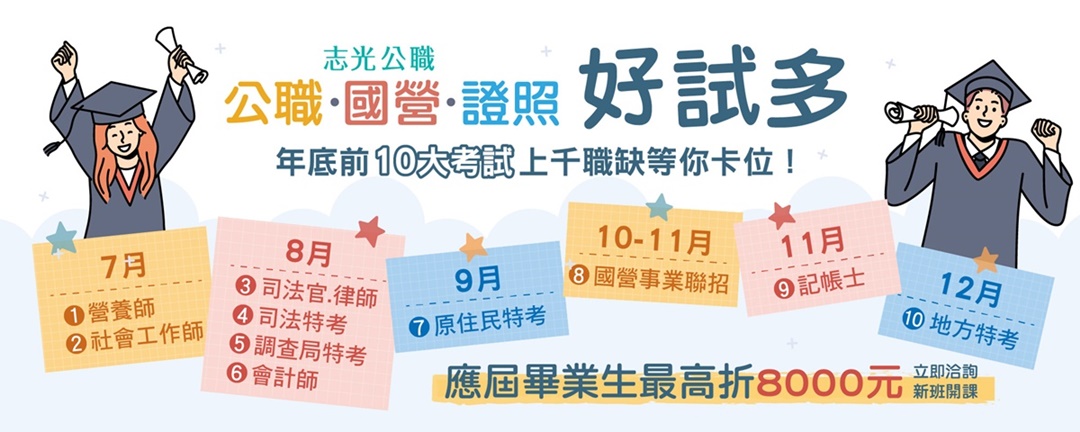 竹北志光提供您最齊全的國家考試(高普考、司法特考等)、國營事業考試(台電招考等)、國家證照考試等資訊,我們也提供線上模擬測驗及歷屆考古題、考取學員心得分享外,另有多元的優惠活動,我們提供完整的資訊為服務。