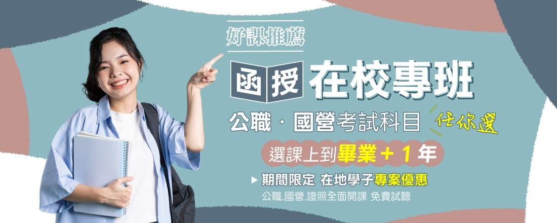 依據考選部公告的數據看出,絕大多數考試別/類科不論在報考年齡及上榜年齡,25歲以下明顯佔比最高,大學在學同學應提早出擊及早上榜!現在公職考試科目大多都與大學課程內容相似,讀起來游刃有餘外,遇到不懂的問題還可以詢問課堂教授,或者利用學校資源來獲得答案,這種免費又有用的資訊肯定要好好保握。視訊與函授課程都有在學專班(多類科皆有,請洽各班服務專員),專為在學生量身打造的課程,可以隨著在學期間所上的科目選擇每年要上的科目,課程服務也持續到畢業後一年,在學期間開始準備勝算最大!