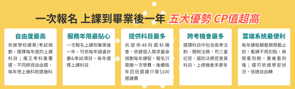 ■最低加萬元起,即擁有二年完整課程 ■一次繳費,可享輔考至畢業後一年 ■大四才開始準備,爭取更多備考時間 |