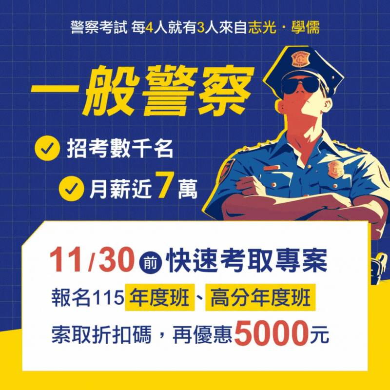 在地就業首選地方特考!移民(英文)三等63%/四等34%,警察錄取分數50,現在準備正是時候!在校生最大優惠來啦~記帳士憑學生證只要8000!!