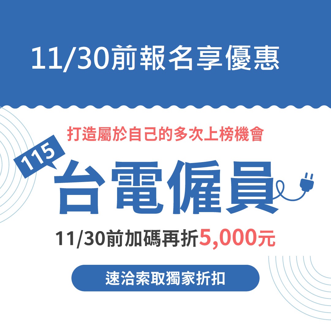 想加入台電擁有穩定的收入和未來保障,但又擔心自己無法在短時間內準備好考試?不用擔心!現在就報名玉里志光視訊、函授,多元學習模式。正規班、題庫班、口試技巧,最完整的課程。更多優惠詳情請洽專線03-8885021