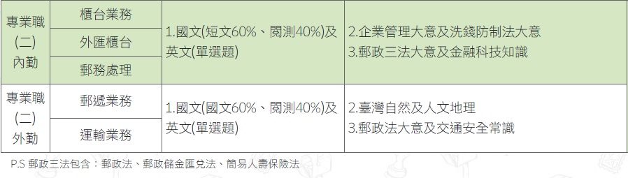 | 企管業務類B | 國文(測驗、作文、公文) 英文 公民 企業管理(含行銷學及管理學) 法學大意 經濟學 行政學 運輸學 郵政三法 金融科技知識 洗錢防制法 |