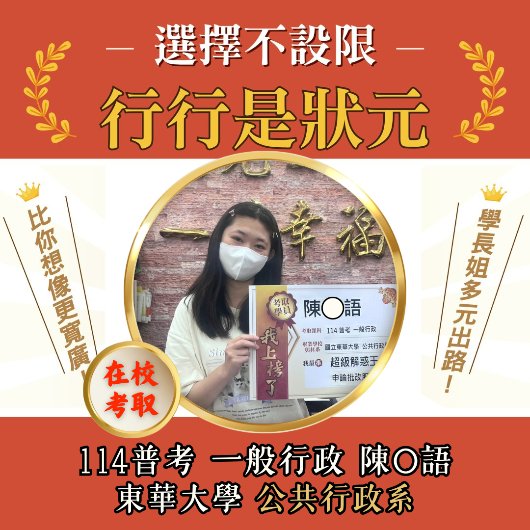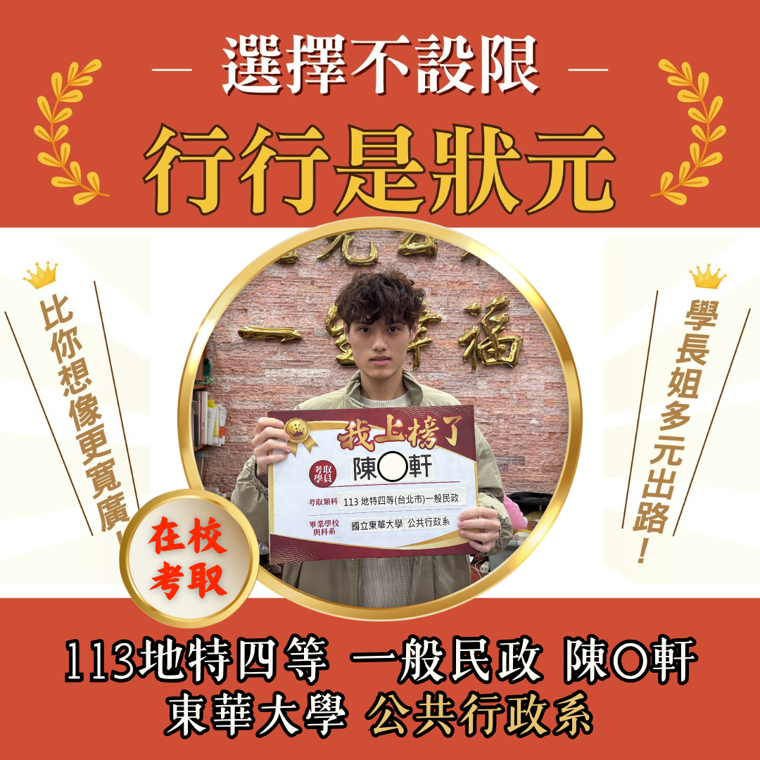 | 【在校專班】在校準備,應屆上榜! 五大獨家優勢 跨領域學習,公職考試/國家就業皆可報考。 想要兼顧課業?雲端函授讓你自主安排學習進度! 專業師資指導,學科知識與考試技巧一次擁有。 時事修法、最新資訊與時俱進! 課程資訊年年更新,命題趨勢及時掌握。 學習時間彈性 每年可任選科目,輔導至畢業後+1年 全面獨享在校生專屬優惠方案 |