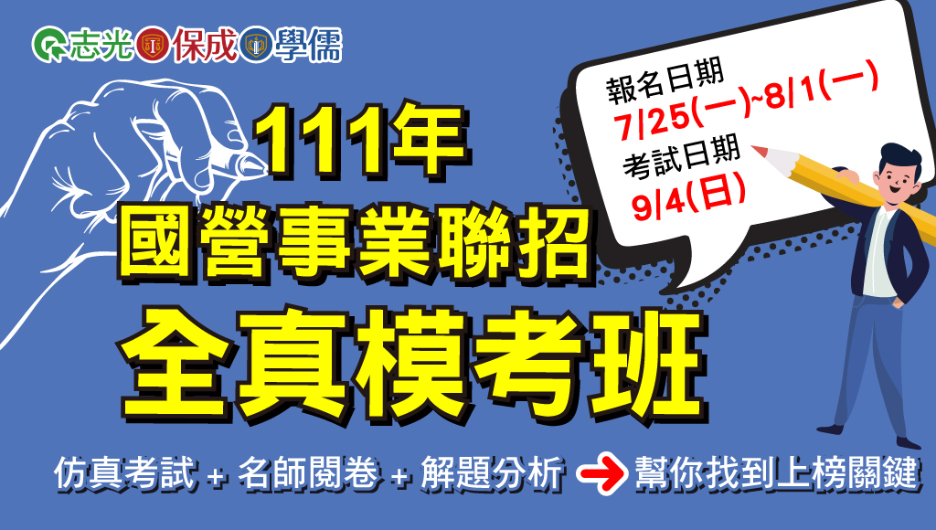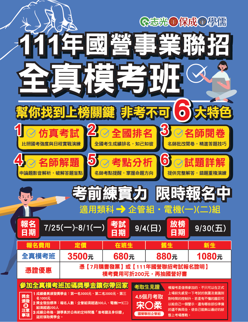 經濟部國營聯招111全真模考班、志光、學儒、保成聯合舉辦,考試提供全國排名、名師閱卷、名師解題、考點分析、試題詳解、考前練實力、提昇考試硬實力。