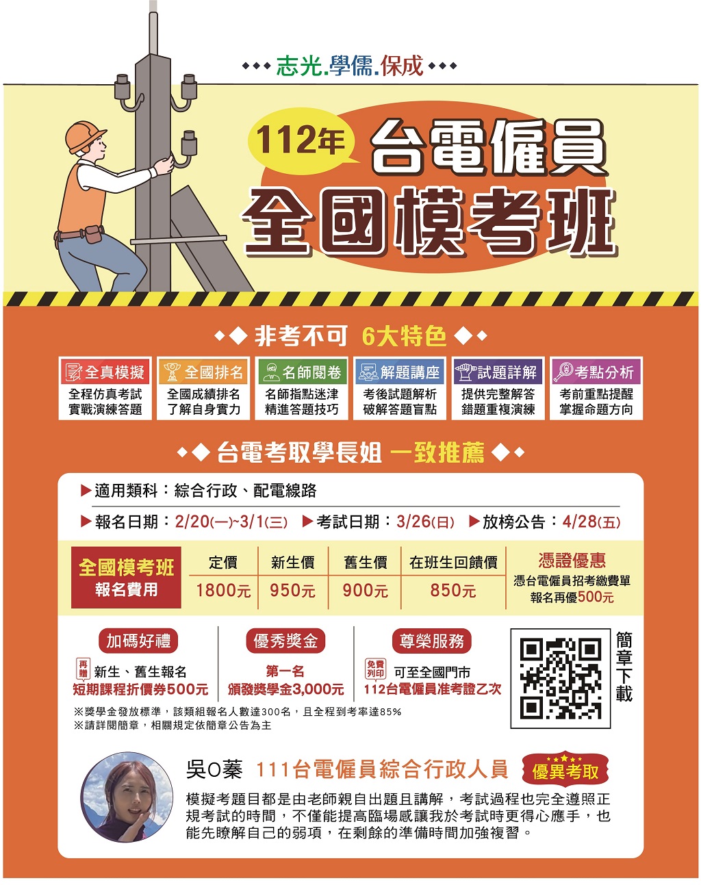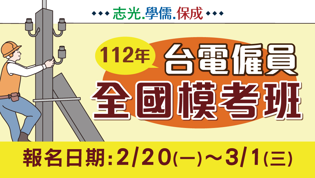 112台電僱員 報名日期:112年2月20日~3月1日止 考試日期:112年3月26日 考試&報名地點:花蓮志光數位學院 模考類組:綜合行政、配電線路維護