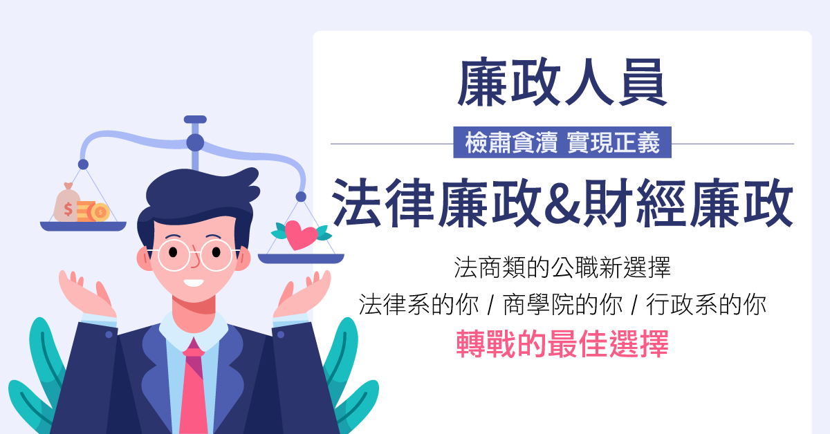 商科相關科系也能實現的正義,法科人的另一種選擇?財經廉政非你莫屬。「財經廉政」負責的業務屬於查核機關內公務員貪腐或違法的事證,順利考上後更要秉持著公平正義的精神,執行工作事項,可說是政府機關裡「廉能」及「效率」的代言人。