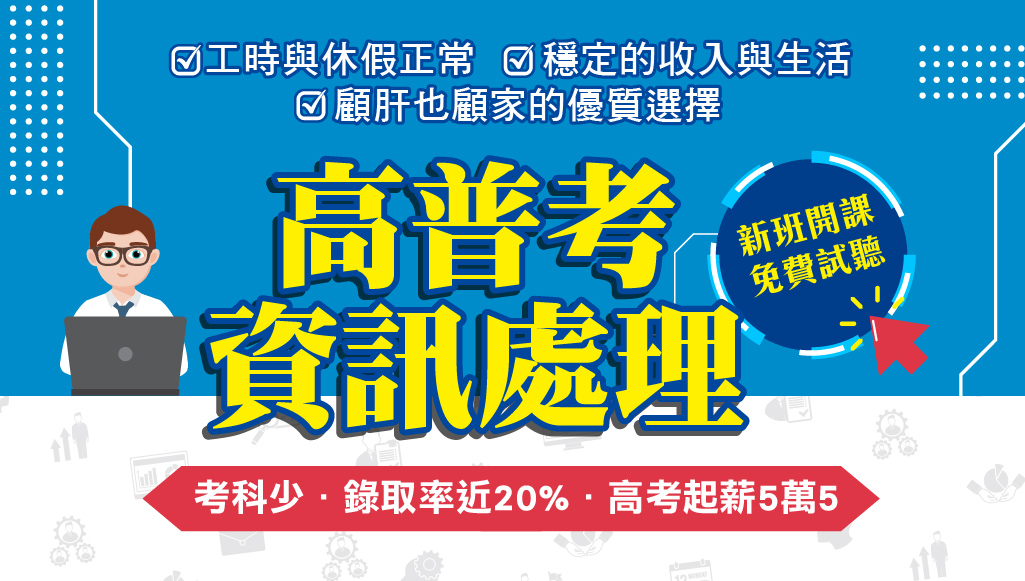 同樣資訊處理類型的工作,公務部門工作穩定、工時正常、薪資不受外界景氣影響。資訊處理無論是在公家機構或國營事業,升遷發展機會高,是十分優質的職業選項。