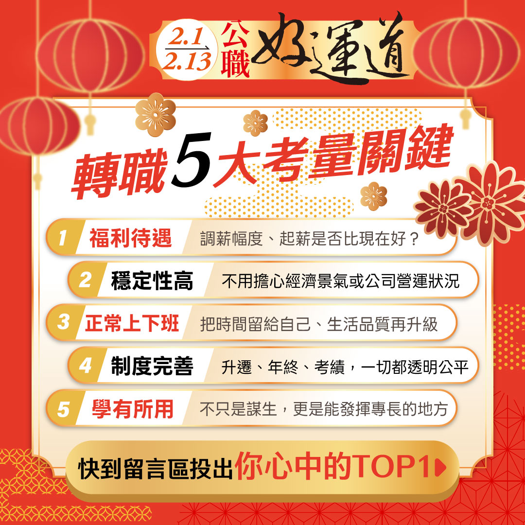 想加薪卻不想再爆肝?公職好運年限定優惠開跑!上班族轉職首選公職,薪資中位數上看3.8萬,67.5%上班族成功拼轉職。2/1(日)–2/13(五) 課程全面82折起,最高現折6000元,限時把握。
