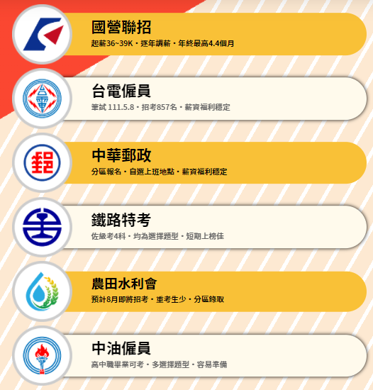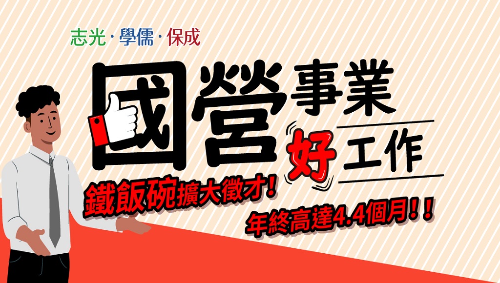 「3/18-3/25求職/轉職必勝專案」,【國營事業招考生力軍】 考科好準備、薪資待遇好,選國營事業就對了!