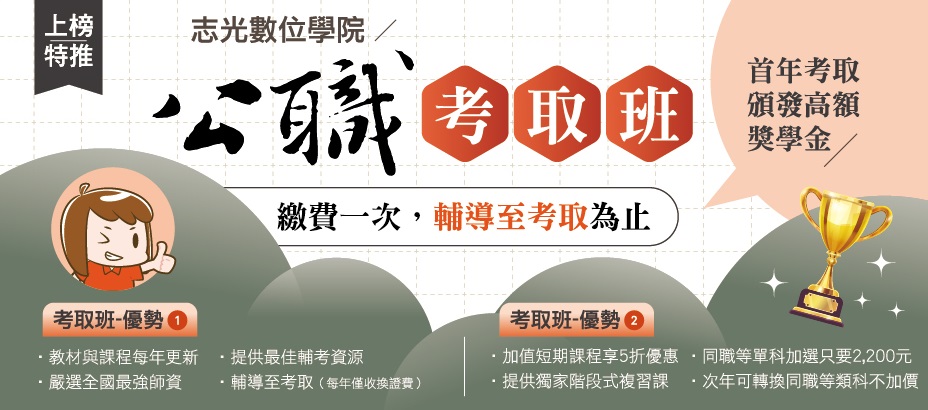 | 雙年度雲端/第二年可升級視訊考取班 一兼二顧,防疫也要顧考取👍 cp值最高的考取方案,讓你學習自由選 備戰國考不間斷,陪你到考取 羅東志光-溪南羅東 在地輔考唯一超級函授/金榜函授直營門市 |