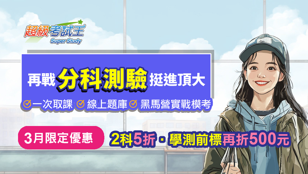 | 3/30(一)前限定優惠-- 1.單科:1科68折、2科62折、3科以上5折。 2.單筆訂單滿2科,持申請一階通過相關通知,贈面試課程。 3.購課贈115分科測驗黑馬營(實戰模擬測驗一回) 4.持115學測前標成績單證明,購分科可現折500元(不限科、限折1次) |