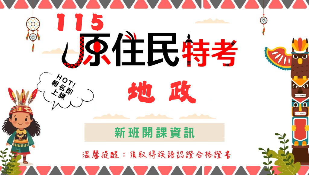 2026原住民特考地政新班開課|原住民特考最貼近家鄉文化的工作環境,非你不可的原住民特考,不但在應考資格上,在工作上也都是和原住民息息相關的。若具有原住民身份,不妨可以了解自己學習背景,選擇自己喜歡的類科全力衝刺。