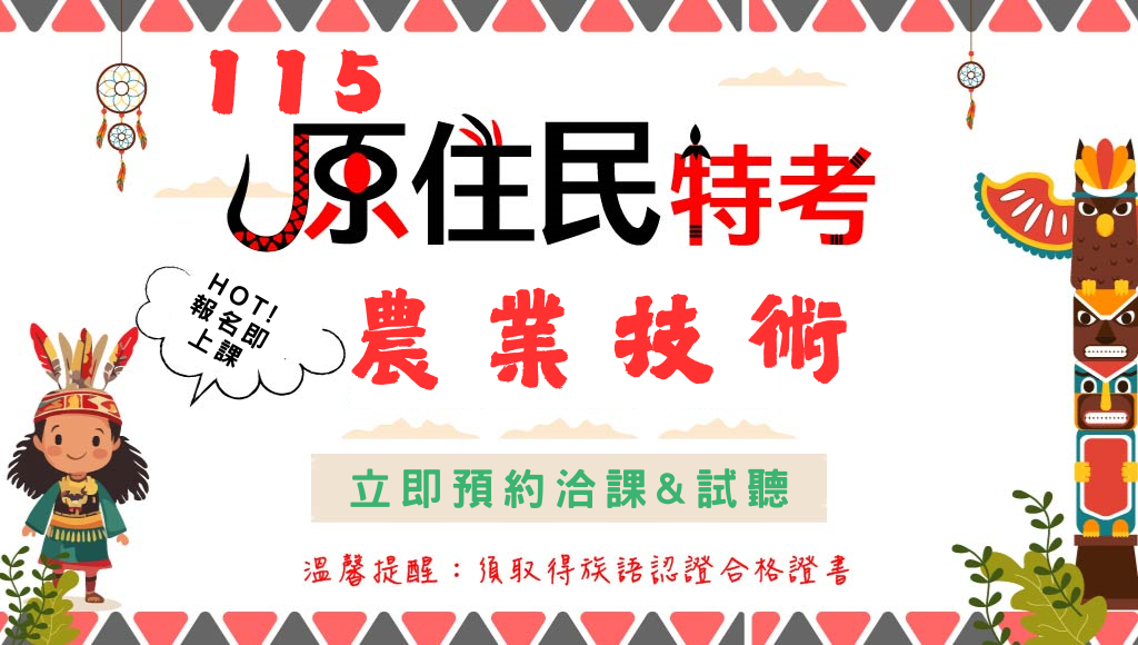 2026/115原住民特考農業行政、農業技術新班開課,原住民特考最貼近家鄉文化的工作環境,非你不可的原住民特考,不但在應考資格上,在工作上也都是和原住民息息相關的。推薦相關科系的同學或有興趣的同學投考。