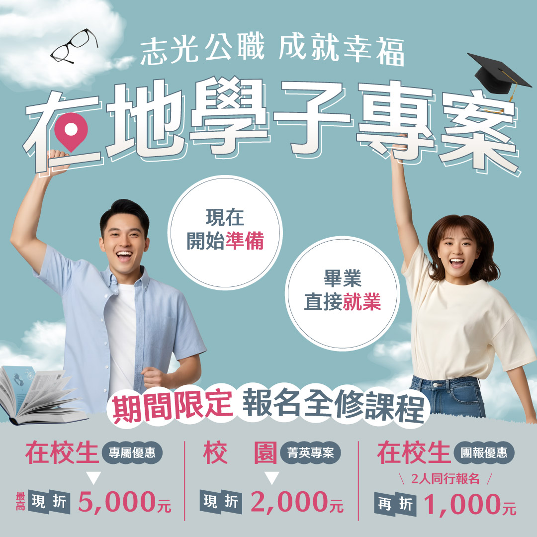 台東志光專辦高普考補習班:115年高普考考試現在準備,擁有充足時間,不論您是工作或在學,擔心時間總是不夠學習?115年視訊到班上課、函授在家學習,新班開課自由任選您的學習模式,上榜生推薦名師及最完整的輔考資源,歡迎來班免費試聽。