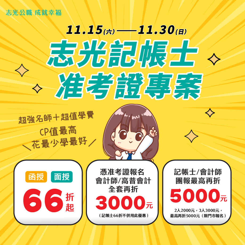 台東志光專辦專技普考記帳士考試課程。想考取記帳士證照嗎?2025記帳士新班開課囉!志光推出函授與雙效學習課程,結合名師教學、題庫演練與雲端學習平台,讓你在家也能高效備考、穩定累積實力,安心衝刺考照目標。
